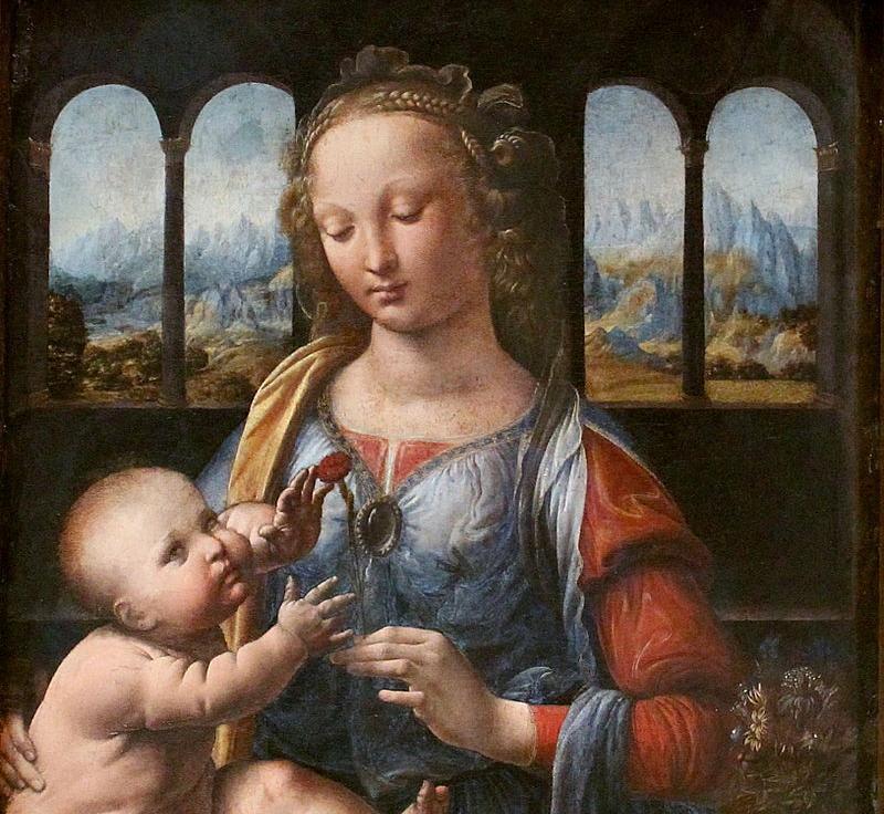 画作中心是圣母玛丽和幼年的耶稣,圣母穿着华丽并饰有珠宝,左手持着一支康乃馨,除去圣母和圣子之外其他景色全部都是黑暗的。起初画作被认为是韦罗基奥的作品,但后来转而成为达芬奇画作。