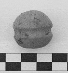 甲骨文中,“弓”字的写法有两种,一种是“ ”,从字形上看,应该是用弓射箭的形态;一种为“ ”,从字形上看,是用一种圆球状东西替代了箭,也就是说是用弓射这种圆球形的东西。由此看来,在商代,弓不仅可以射箭,而且还可以射圆球状物。这种可以射圆球状物的弓,通常被人称为“弹弓”,而上述的后一字也常被隶定为“弹”字。因此,笔者认为商代甲骨文“ ”字中的圆形球状物,可能就是殷墟居住址中常见的小陶球。图一中的陶球中部有一周凹槽,应该弓绳所放的位置。