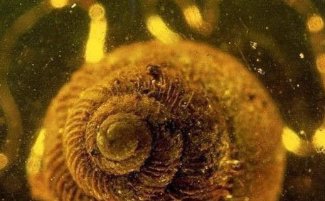 这只1亿年前的蜗牛,这是在硬树脂中发现的最早的生物。这个琥珀是在二十世纪90年代中期发现于黎巴嫩的一处发掘过很多琥珀的地区。这种蜗牛和现在地面上的微小蜗牛十分相似。这个蜗牛琥珀属于罕见的珍品,全世界都找不出几个。