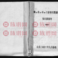 原书: [出版地不详 : 出版者不详], 2003年修. 1册(125页) : 插图, 世系表. 受姓祖 : (东周) 曼父. 居邹城,以为姓. 远祖(1世) : (宋) 邹应龙,字景初,号仲恭,谥文靖. 徽公之子. 宗祖(3世) : (宋元之际) 邹德宏,字少十郎. 殿八郎公次子. 因避乱,自闽之长汀迁广东长乐(今五华县). 广西开基祖(20世) : (明清之际) 邹崇孟. 翠云公第五子. 自广东迁广西柳州,居来宾县石塘村. 崇孟生七子 : 邹养弼(迁武宣稼田村) ; 邹养儒(居桂平平南思旺大鹏) ; 邹养龙 ; 邹养凤 ; 邹养仕(居永培上甫村) ; 邹养富 ; 邹养贵. *龙, 凤, 富, 贵四公后皆不详. 垌生村房祖(26世) : 邹瑞清. 养儒公后. 生三子 : 邹显章 ; 邹颢才 ; 邹显志. 花鹿村开基祖(26世) : 邹瑞英. 养儒公后. 生二子 : 邹显鑫 ; 邹显仁. 铜古村开基祖(27世) : 邹显德. 瑞麟公之子. 养儒公后. 生二子 : 邹国贞 ; 邹国祥. 下办村开基祖 : 不详. 由3世邹德元开始记载. 由高腰县迁居广西平南官城下办村(牛梯磅). 桂平蒙圩开基祖 : 邹恩. 字辈 : 崇养良邹 士翰瑞显国家兴 成天启业悦文章 祖德世传永贤良 志朝光宗荣华兆 明理积善万年昌. 散居地 : 广西省桂平县大湟江口镇, 平南县等地. 书名据书衣题编目.