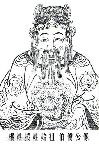 杨伯侨(公元前724年~?),侨亦作桥、乔,又名文实。晋献公诡诸之弟,姬称次子。时任中大夫。周襄王(姬郑)五年(公元前647年),王念其先人功勋,敕封于杨(国名,今山西洪洞县东南),称杨侯,敕命杨侯太祖。其六世孙杨道为避难始以祖地杨(邑)为氏,被后世尊为“杨氏授姓”始祖,史称杨氏正宗,是为天下“杨氏”始祖杨伯桥。卒谥贤敬。配于氏,生三子,逊、近(字子恭,为邑宰驻守洪洞杨国)、述(字子宪,晋国令尹)。