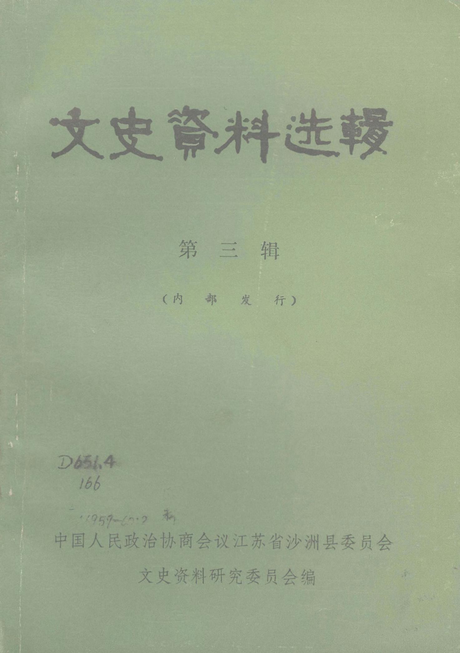 文史資料選輯第三輯_政協江蘇省沙洲縣委員會文史資料研究委員會