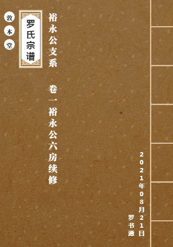 《桂北罗氏宗谱》记载:宗祠地址:湖南省桂阳县仁义镇大湖村中桥组 始祖:裕永公 郡望:豫章郡 堂号:敦本堂 始迁时间:大约是元末明初战乱时期 原籍地点:江西省泰和县鹅颈丘 世次修谱纪: 首修嘉庆二十三年九月(公元1818年) 二修同治元年九月(公元1862年) 三修光绪十六年十二月(公元1890年) 四修民国九年(公元1920年) 五修民国三十八年(公元1949年) 六修公元2012年壬辰年 六房次第纪: 长房万一公居中桥派又居新田神仙洞和南乡(现方元下廊)等地; 二房万二公居旺子村; 三房居万五公居栗塘下; 四房万十公居樟木山和分居车头; 五房万六公居乌石渡和分居洞头; 六房万三公居庄溪。 注:三房和五房因修建欧阳海水库于公元1965年部分移民县域乡镇和郴州等地 字辈排行纪: 先前排行(16字) 长房居中桥:裕万法堂景,仲福才祖宗,世大上良天,富 二房旺子村:裕万法堂思,智永仲廷召,孟季荣华世,代 三房栗塘下:裕万法堂付,才思祖宗仁,显金志斯文,成 四房樟木山:裕万法堂景,兴以仁德志,廷显祖宗世,大 四房居车头:裕万法堂景,应祖义发远,才仲永尚文,子 五房乌石渡:裕万法堂景,汉孟仲金凤,明显云光宗,天 五房居洞头:裕万法堂景,汉孟仲应锦,衣有荣世代,傅 六房居庄溪:裕万法堂高,声应廷思文,才仁义礼智,大 嘉庆二十三年(公元1818)六房合族后字辈排行(40字) 学立安朝邦,诗书启秀贤,修身希孔圣,宏治羡虞唐, 兰桂和松茂,竹林映杏芳,业隆辉楚国,名振耀南湘。 树高千尺总有根。现借“罗氏通谱网”“中华罗氏XX联谊群”等网络平台,恳请罗氏宗亲留意,互相传阅,弘扬中华罗氏文化,聚集中华罗氏精英,增强联谊交流,协助寻根溯源、寻亲睦族,促进罗氏繁荣昌盛! 我是桂北罗氏裕永公长房廿三世孙→罗书潭,有意者关注我的QQ空间“相册”中上传有宗谱,供宗亲浏览共享,如有同宗族人,欢迎来人来涵联系。 联系人与电话:罗书潭13975547295(微信同号) QQ:1980828192