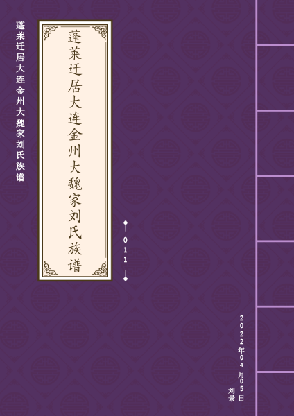 我刘氏家族上溯至1世祖,名讳失考,在明代永乐年间(1404年左右)从云南乌撒卫迁至山东蓬莱,2世祖刘兴迁至蓬莱城东十里堡。至6世刘氏家族施行了分房,共分成⑥房各自排字辈。6世祖刘思贤为第⑥房(与刘思明⑤房相同)字辈是:“思山世汉 汝国振文”,山东蓬莱城东一带居住(或已迁到刘家旺)。清康熙末年至雍正初年向关东移民有优惠政策。1720年左右,第⑥房10世祖刘汝典携四个弟弟及子侄航海到关东金州城北平山定居,即金州大魏家刘家村定居生活延续至今。至13世“文”字辈开始向大魏家刘家村周边的王家村、干岛村迁移。其中刘文广、刘文序在清嘉庆十三年1811年其全家到昌图后又迁到梨树县大榆树开基立业。2021年查询到两部族谱和一部续谱,分别由金州迁居梨树的族人和蓬莱十里堡(埠)族人保存的。山东省登州府蓬莱县十里堡《刘氏合族谱序》是由12世振字辈在乾隆四十七年(1782年)与6世时分房的其他5房联合重修的。记载1世至6世祖,6世分房后各房的传承和迁徙等大事记。⑥房(6世祖刘思贤一族)记载至13世的刘文序(1782年出生),以后出生的国、振、文字辈的就没有记载。奉天省梨树县昌图府大榆树《续修刘氏谱序》,是民国十一年(1922年)由17世刘宗峤续修从金州迁至梨树分支的13世文字字辈—18世肇字辈家谱,自德字辈分房。金州族人再没修家谱,仅有的宗谱因分家和破“四旧”等因素使“振文德”这3辈的传承关系失考。近些年有的家整理宗谱,但已大多追溯不到德字辈及以上了。还好,我们这支能够溯源。字辈:1922年梨树刘宗峤《续修刘氏谱序》中记载20字辈:“德秉毓宗肇 谟烈丕绪芳 升登为衍庆 永显义业昌”。在前几年未见到梨树《续修刘氏谱序》中记载的20字辈情况下,在瓦房店太阳乡张屯查询到抄录在刘冠谋家的老宗谱背面的字辈:“德秉毓宗肇 谋烈丕绪芳 升登维延庆 永显殿业昌”。蓬莱十里埠族人保存的族谱记载。1-2枝:德秉熙和兆 光连日道黄(光明大道长) 含宏开巨式 允裕显荣昌。3枝:德秉(龄)毓宗肇 谋烈丕树芳 升登惟衍庆 永远百世昌。四份字辈记载都有百年以上的历史,有可能约定保持意义基本不变可改字,便于区分各房。待考证。《刘氏合族谱序》是联合6房共同重修的刘氏族谱,并约定自14世开始统一使用20字辈。我们是迁居金州的刘汝典及其四兄弟的后代,据宗谱考证是老五刘汝诰一脉。