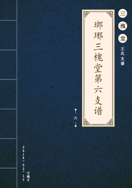 瑯琊王氏族谱序:王氏族谱,谱王氏之族也,王氏有姓,系出于周自灵王太子晋之子宗敬为司徒,能其官,堂号称王家嗣,窜入者数家支,分流别而要以瑯琊嫡派今瑯琊东桥子居.王氏系瑯琊世谓也,其居海州时仍号三槐堂,明时有讳集庆,诸邑子姓繁衍凌凌,推为始祖,七老岭分支有择居东桥子者,垦田务农,世世耕读,与我家里居相近,代有婚姻,故未经撰序,公吾称表祖,焉自章已。公历1985年2月12日王暖才 (抄自老谱书) 序言。由以上谱录看较模糊,为此本编多次并反复考量,根据谱传从第四代开始各立谱书推断,始祖王璧(字集庆)之六子王继贤公之子王斟公之六子王乙宣是各家堂所冠;瑯琊三槐堂第六支家谱。以上考量是否有误,谨请族人给预指正。 王暖才 2016.2.13